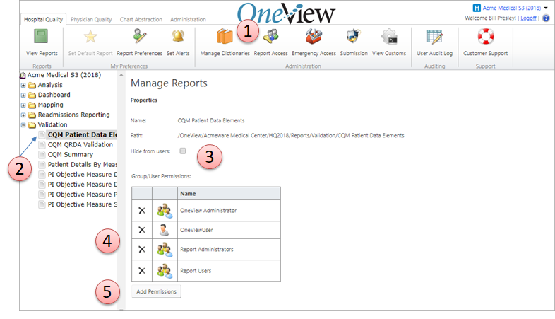 This functionality can be found in the Adminstration Grouping This option is only be available to users assigned to the Systems Administrator Role in the Hospital Quality package. Report access is used to assign permissions to user and/or groups to access reports under the Hospital Quality Package.